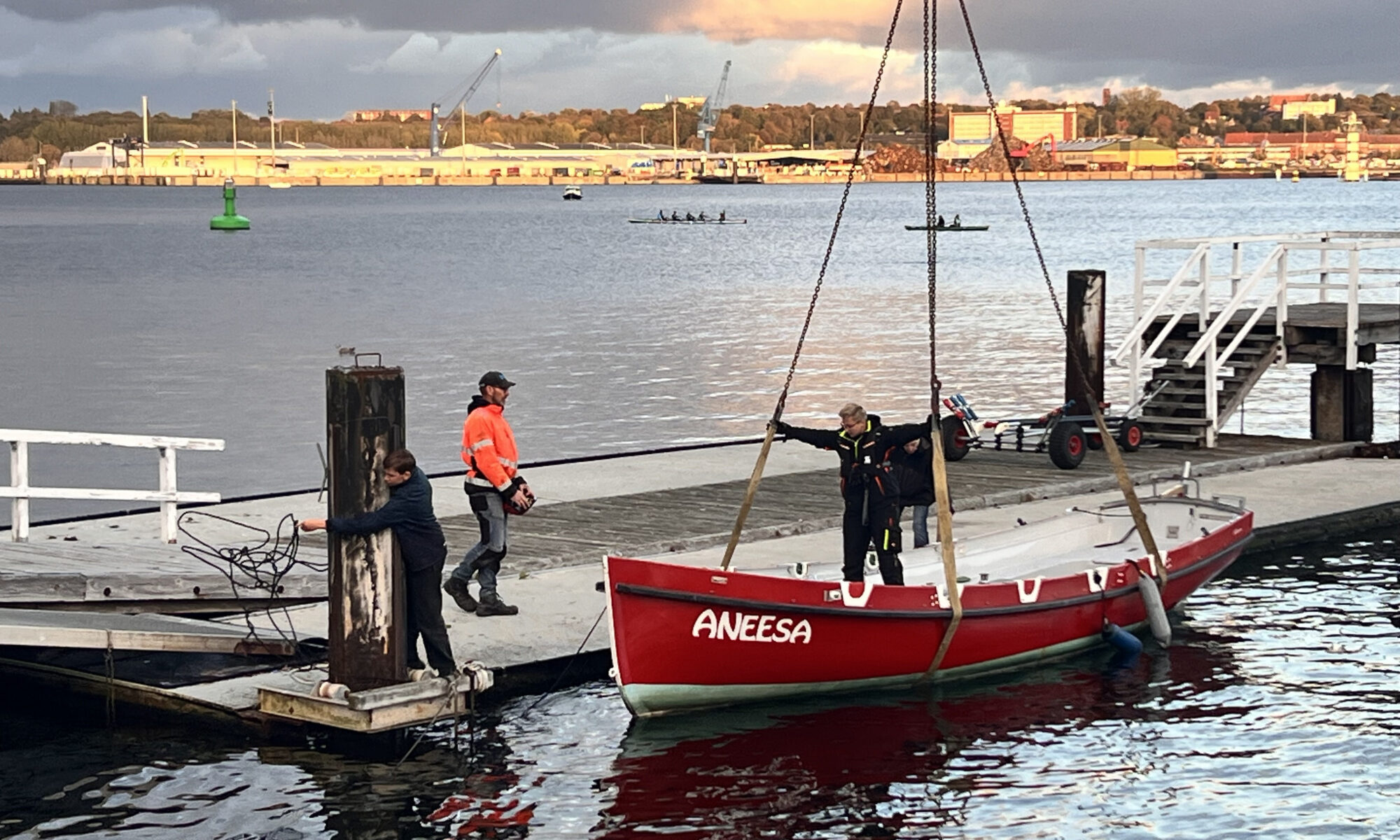 Wie immer kam Peer mit seinem riesigen Kranwagen auf die Kiellinie und nahm professionell das Szepter in die Hand, um alle MKJ-Boote nacheinander an Land zu stellen. „Regulus“ erhielt diesmal den größten Aufwand zugebilligt. Ihr Bootswagen stand auf dem Trailer des Kutters „Aneesa“. Als das Gespann sicher und fertig verzurrt war, übernahm Dirk die Fuhre, um die Varianta in eine Scheune bei Kiel zu bringen, immer Jens an der Seite. Die übrigen Schiffe waren in Windeseile auf dem Trockenen, untenrum geputzt und am jeweiligen Winterplatz abgestellt. Auch die „Johanna“ in Schilksee schwebte derweil ins Außenlager. Die umfängliche Vorbereitung machte sich bezahlt. Sogar das Aufräumen geriet so fix, dass die gesamte Aktion noch vor Dunkelwerden erledigt war – und im Gruppenraum noch ein kräftiger Schlag Nudeln mit Tomatensoße „vernichtet“ werden konnte, den Tina und Dörte unter den fleißigen Mitarbeiterinnen und Mitarbeitern austeilte. Einzig die Planen mussten noch über die Kutter gezogen werden. Nils machte sich am selben Abend bei „Aneesa“ im Stockfinstern daran, Jörn und Jonas am darauffolgenden Tag bei „Fritjof“.